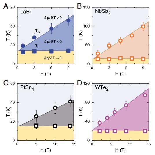 But in particular, researchers in the Cava lab noticed that five materials with extreme magnetoresistance yet very different structures and chemical make-up all share the same characteristics when their resistance-temperature-applied-magnetic-field diagrams are measured. This diagram maps the temperature and magnetic field strength at which the material's magnetoresistance turns on and then saturates. Using the phase diagrams as a clue, scientists may be able to identify other materials with extreme magnetoresistance.