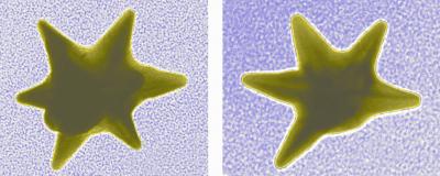 Novel nanoparticles being tested at the National Institute of Standards and Technology (NIST) have researchers seeing stars. In a recent paper,* NIST scientists used surface-enhanced Raman spectroscopy (SERS) to demonstrate that gold nanostars exhibit optical qualities that make them superior for chemical and biological sensing and imaging. These uniquely shaped nanoparticles may one day be used in a range of applications from disease diagnostics to contraband identification. SERS relies on metallic nanoparticles, most commonly gold and silver, to amplify signals from molecules present in only trace quantities. For these types of experiments, scientists shine laser light on an aqueous solution containing the nanoparticles and the molecule of interest and monitor the scattered light. The detailed characteristics of both the molecule and the nanoparticle affect the strength of scattered light, which contains an identifying fingerprint for the molecule known as its vibrational signature. With nanoparticles amplifying the signature, it is possible to detect a very low concentration of molecules in a solution.