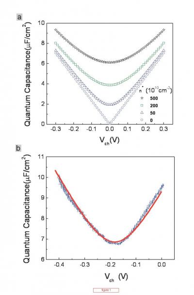 In the current study, two electrodes were attached to graphene, and a voltage applied across the material's two-dimensional surface by means of a third, gate electrode. Plots of voltage vs. capacitance can be seen in fig1. In Tao's experiments, graphene's ability to store charge according to the laws of quantum capacitance, were subjected to detailed measurement. The results show that graphene's capacitance is very small. Further, the quantum capacitance of graphene did not precisely duplicate theoretical predictions for the behavior of ideal graphene. This is due to the fact that charged impurities occur in experimental samples of graphene, which alter the behavior relative to what is expected according to theory.