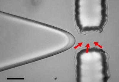 Inventing a useful new tool for creating chemical reactions between single molecules, scientists at the National Institute of Standards and Technology (NIST) have employed microfluidics—the manipulation of fluids at the microscopic scale—to make microdroplets that contain single molecules of interest. By combining this new microfluidic "droplet-on-demand" method with "optical tweezers" that could merge multiple droplets and cause their molecular contents to react, the research may ultimately lead to a compact, integrated setup for obtaining single-molecule information on the structure and function of important organic materials, such as proteins, enzymes, and DNA. With the aid of NIST's Center for Nanoscale Science and Technology, physicists Carlos López-Mariscal and Kristian Helmerson created a tiny microfluidic device with a channel through which water can flow. Squeezed into a narrow stream by a mixture of oils whose viscosity, or resistance to flow, exerts pressure on it, the water then enters a narrow constriction. The water's abrupt pressure drop—accompanied by a dash of detergent—breaks its surface tension, splitting it into small droplets. (This same effect occurs when a thin stream of water falling from a faucet breaks up into small drops.)