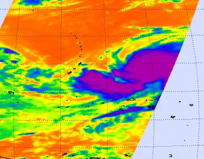 NASA's Aqua satellite flew over Super Typhoon Melor on October 1 at 15:59 UTC (1:59 a.m. Guam local time), and captured in infrared image of the storm's clouds using the Atmospheric Infrared Sounder (AIRS) instrument. AIRS takes the temperature of the storm's highest, cold clouds and revealed very high, powerful thunderstorms. Those cloud tops were as cold as or colder than 220 degrees Kelvin or minus 63 degrees Fahrenheit (F). The colder the clouds are, the higher they are, and the more powerful the thunderstorms are that make up the tropical storm.