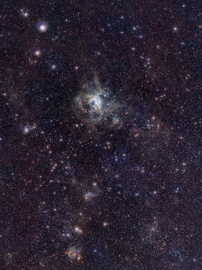 The wide-field image shows a host of different objects. The bright area above the centre is the Tarantula Nebula itself, with the RMC 136 cluster of massive stars in its core. To the left is the NGC 2100 star cluster. To the right is the tiny remnant of the supernova SN1987A (eso1032 - http://www.eso.org/public/news/eso1032/). Below the centre are a series of star-forming regions including NGC 2080 — nicknamed the "Ghost Head Nebula" — and the NGC 2083 star cluster.