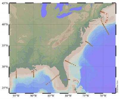 Wang and his colleagues conducted their fieldwork in 2007 aboard the R/V Ronald H. Brown. Starting in the waters off Galveston, Texas, they worked their way around the Louisiana and west Florida coasts, past the Florida Straight, and up the eastern seaboard, collecting samples along nine different transects that ran from the coast to deep ocean off the shelf break, up to 480km (300 miles) offshore.