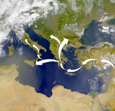 Or did they travel by sea? And if so, by what route? Did they travel directly from the coast of Levant to Crete and then across to Greece, as one theory holds? Or did they first travel north into Anatolia and then island hop from Turkey across a large group of islands, called the Dodecanese, to Crete and, from Crete, on to Greece and Europe?