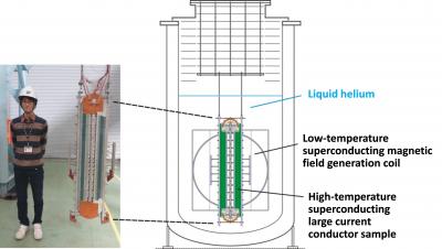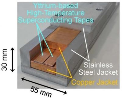 As a result of the prototype conductor test, at the absolute temperature of 20 degrees Kelvin (minus 253 degrees Celsius) the electrical current exceeds 100,000 amperes. The overall current density exceeds 40 A/mm2 including the jackets, and this value is of practical use for manufacturing large-scale fusion reactor magnets. This result is of global importance. We use 54 yttrium-based high-temperature superconducting tapes. Each tape is 10 mm in width and 0.2 mm in thickness.